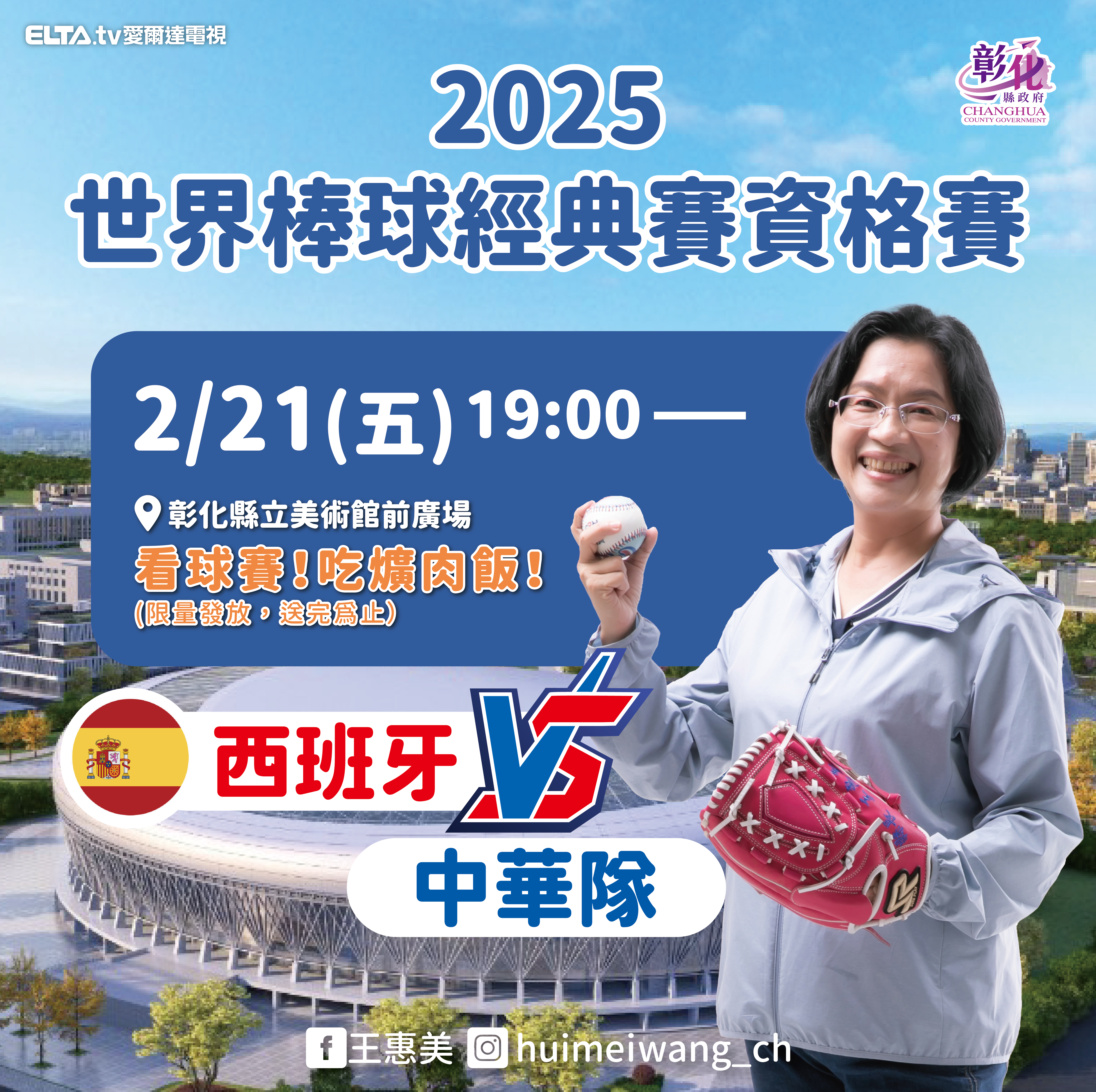 2/21(五)19:00 西班牙vs.中華隊 2/22(六)19:00 中華隊vs.南非 2/23(日)19:00 尼加拉瓜vs.中華隊。[記者蔡鳳凰攝]2025 WBCQ世界棒球經典賽資格賽,中華隊爭取WBC正式賽資格,彰化縣長王惠美縣府團隊特別於2月21日至23日在美術館前廣場美食應援同步直播,王縣長邀請鄉親一起為中華隊加油打氣。連續三天活動現場提供彰化在地特色美食,讓大家一邊品味家鄉的美味,一邊欣賞精彩比賽,與全國球迷共享棒球熱潮。