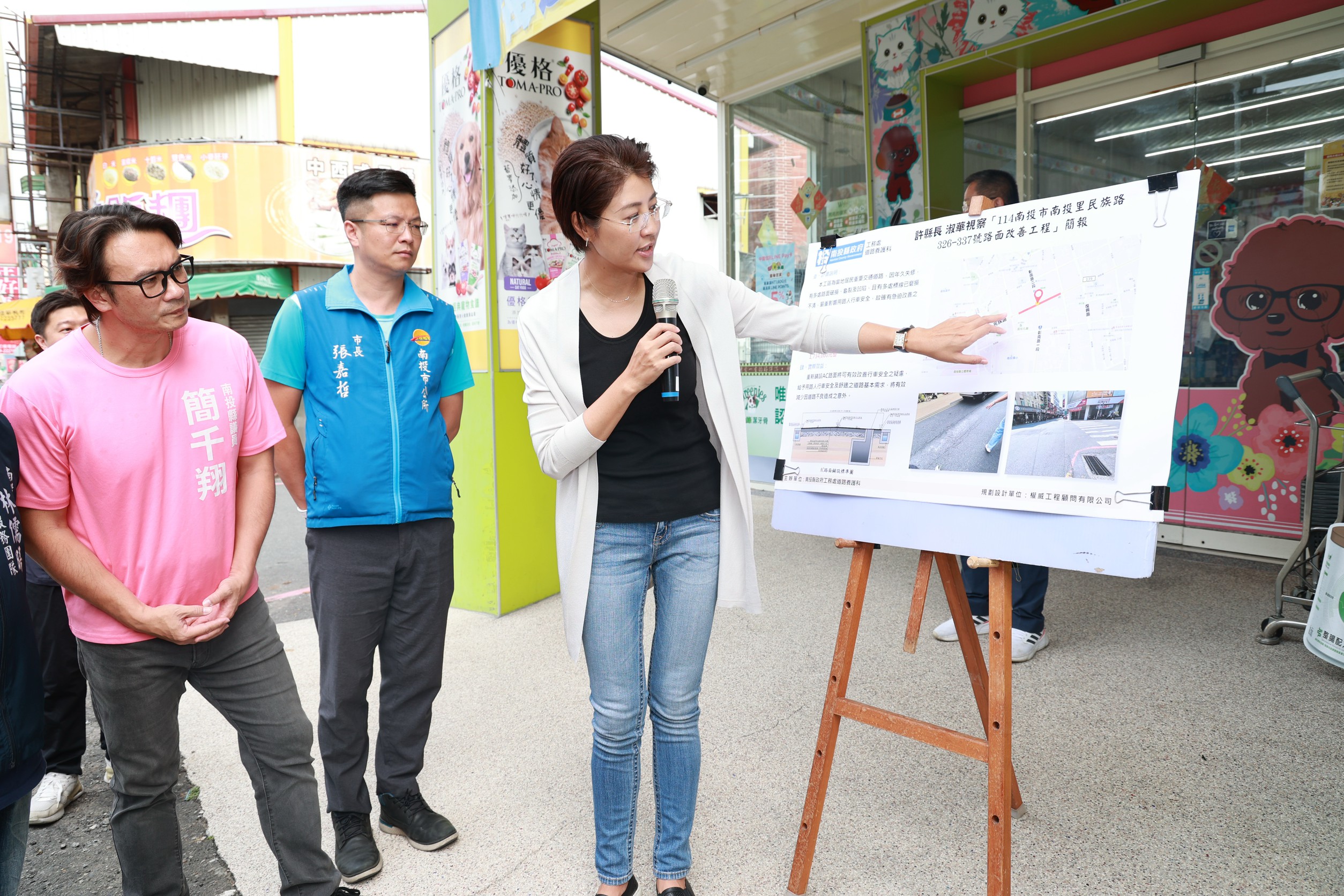許縣長先到市區民族路了解道問題,該路326-337號前,路面老舊、破損,標線模糊不清,考慮該路是交通要道,道路品質影響安全,許縣長察看路況後,決定動用173萬元改善。